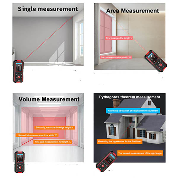 레이저 레인징 기능 -? 측정 면적, 길이, 부피, 피타고라스 계산, 플러스/마이너스 측정,